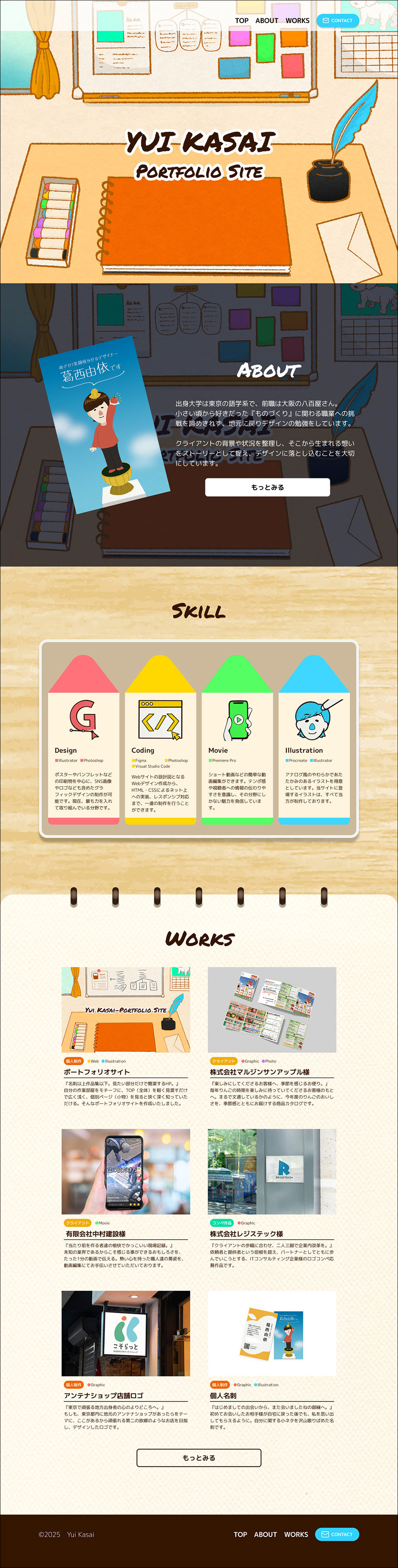 見る人が知りたい情報だけを確認することができるポートフォリオサイトを目指しました。時間がない方向けに、TOPページのみで簡潔するようにデザインし、私に興味がある方にはより深く作品を見ていただけるように意識しています。